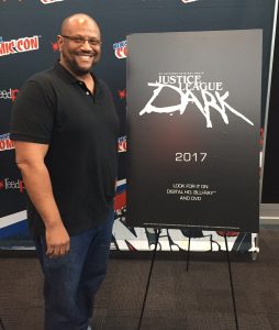 Executive Producer James Tucker with the promo poster for Justice League: Dark.